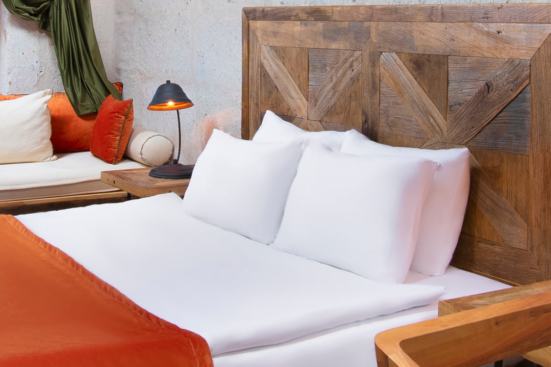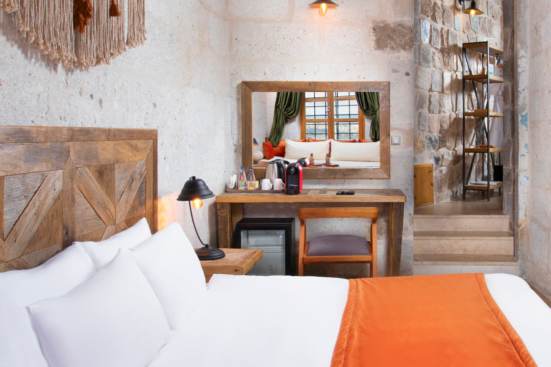 The Superior Deluxe Room at Dream of Cappadocia combines the elegance of handcrafted wooden furniture with a blend of traditional and modern design. This unique space features three distinct areas: one offering a breathtaking valley view, another with intricate cave and stone carvings, and the third located within the natural serenity of a cave.